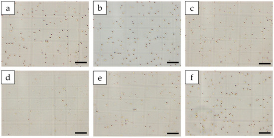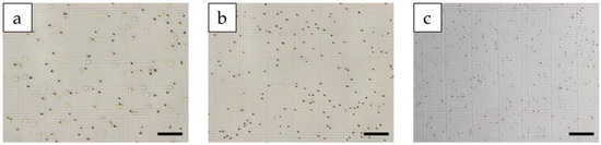 The ultrasonic destruction rate was calculated using an optical microscope (IX73, Olympus, Tokyo, Japan) and a hemocytometer (8100204, Hirschmann, Stuttgart, Germany). Four optical micrographs were taken of each sample, and undamaged cells were counted before and after ultrasonic irradiation. The destruction in algae and microcapsule cell numbers after sonication for n minutes () was calculated using the following equation from the number of cells counted at n min and the original number of cells at 0 min [33]: