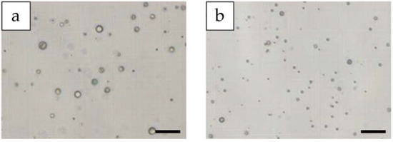Microcapsules were used as pseudoalgae. Figure 2 shows optical photomicrographs of each microcapsule before ultrasonic irradiation. The microcapsules (Chemitech, Tokyo, Japan) used in this experiment were fats and oils encapsulated in a melamine spherical shell. The volume ratio of shell to content was 1:4, and the thickness of the shell was about 7% of the radius. Before ultrasonic irradiation, all capsules are spherical. The samples used were polydisperse microcapsules A with a mode diameter of about 11.8 µm and polydisperse microcapsules B with a mode diameter of about 4.6 µm. The mode diameter of each microcapsule was measured using a laser diffraction particle size distribution analyzer (SALD-2300, Shimadzu). The Young’s modulus of each microcapsule was measured using a scanning probe microscope (SPM-9700, Shimadzu) and was found to be 73 and 33 MPa, respectively. The concentration of capsules was adjusted to 107 capsules/mL by using purified water produced by ultrapure water production equipment.