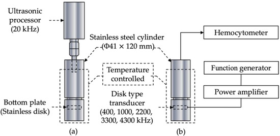 Schematic diagram of sonication system at (a) 20 kHz and (b) 400, 1000, 2200, 3300, and 4300 kHz.