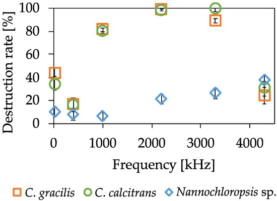 Figure 4 shows optical photomicrographs of C. gracilis 2 min after ultrasonic irradiation at each frequency. Cells counts were obtained using these images, and the destruction rate was calculated according to Equation (1). A similar analysis was performed on C. calcitrans and Nannochloropsis sp. to examine the frequency dependence of the fracture rate. Figure 5 shows the destruction rate of the algae used in this experiment at each frequency. The irradiation time was 2 min, and the sound power was 10 W. The ultrasonic destruction effect on C. gracilis was highest at 2200 kHz and lowest at 400 kHz. The ultrasonic destruction effect on C. calcitrans was highest at of 3300 kHz and lowest at 400 kHz. The ultrasonic destruction effect on Nannochloropsis sp. was highest at 4300 kHz and lowest at 400 kHz. Frequency dependence was observed in the ultrasonic destruction of the algae used in this experiment. However, because the experimental setup was different at 20 kHz, the ultrasonic intensity at 20 kHz differed from that at the other frequencies.