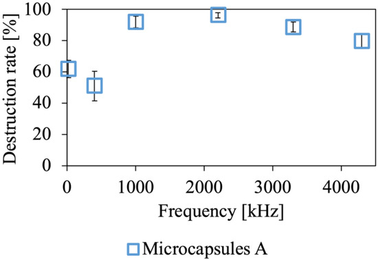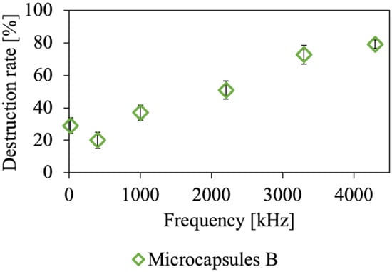 Figure 6 and Figure 7 show the destruction rates of microcapsules A with a mode diameter of about 11.8 µm and microcapsules B with a mode diameter of about 4.6 µm at each frequency. The irradiation time was 30 min, and the sound power was 10 W. As shown in Figure 6, the ultrasonic destruction effect on microcapsules A was highest at 2200 kHz and lowest at 400 kHz. Furthermore, Figure 8 shows the particle size distribution before and after ultrasonic wave irradiation at 2200 kHz, which indicates the typical particle size change. Figure 8 shows the ultrasonic destruction effect on microcapsules B was highest at 4300 kHz and lowest at 400 kHz. However, because the experimental setup was different at 20 kHz, the ultrasonic intensity at 20 kHz differed from the other frequencies.