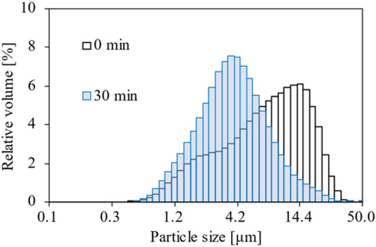 Figure 10 shows a block diagram of the experimental setup. A cylindrical stainless steel sample tank (inner diameter 48 mm × height 170 mm) was installed above the 26, 200, 430, and 950 kHz ultrasonic generators (QUAVA mini, Kaijo Corporation, Tokyo, Japan). The suspension was directly irradiated with ultrasonic waves. The sound power was the same as that in the previous experimental setup (10 W). Cooling water was circulated outside the sample tank, and the sample temperature was kept constant at 20 ± 1 °C. A 100 mL sample was irradiated with ultrasonic waves for up to 30 min. All experiments were performed 3 times for reproducibility.