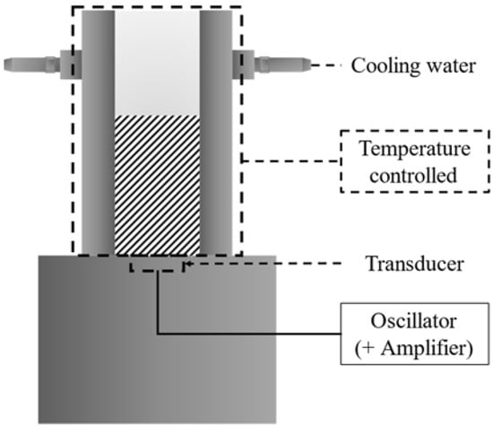 Figure 3 shows a block diagram of the experimental setup. This system is based on our design in which the important parameters (e.g., frequency, acoustic power, and temperature) in the reactor can be easily changed. This system also makes it possible to study the exact effect of ultrasonic cavitation using a small sample volume. The frequencies of the ultrasonic waves used in the experiment were 20, 400, 1000, 2200, 3300, and 4300 kHz. Because 20 kHz is used in many other studies [39,40,41], it was also adopted in this study. The sample tank used was a combination of a homemade cylindrical stainless-steel tank (inner diameter 41 mm, height 120 mm) and either a base for holding a stainless-steel bottom plate (when using 20 kHz) or a disk-type piezoelectric (PZT) transducer (400, 1000, 2200, 3300, 4300 kHz). The suspension was directly irradiated from the upper part of the sample tank using a horn-type transducer (VC750, Sonics & Materials, Inc., Newtown, CT, USA) with a diameter of 13 mm at 20 kHz. At other frequencies, a disk-type PZT transducer (Fuji Ceramics, Fujinomiya, Japan) with a diameter of 30 mm was installed at the bottom of the sample tank, and the suspension was directly irradiated. Sound power was measured by the calorimetry method and was constant at 10 ± 1 W in all experiments [42]. Cooling water was circulated outside the sample tank, and the sample temperature was kept constant at 15 ± 1 °C. A 100-mL sample was irradiated for 10 min and a sample was taken every 2 min. All experiments were performed 3 times to ensure reproducibility.