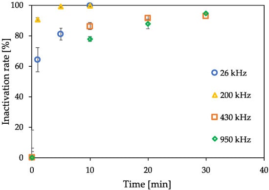 Figure 11 shows the plankton inactivation rate at each frequency. The inactivation rate differed depending on the frequency of the irradiated ultrasonic waves. It was confirmed that the inactivation rate increased with irradiation time. At 26 kHz, the inactivation rate increased with irradiation time until it reached almost 100% after 10 min of irradiation. At 200 kHz, the inactivation rate was about 90% after 1 min of irradiation and about 99% after 5 min of irradiation. At 430 kHz, the inactivation rate was about 86% after 10 min of irradiation, and at 950 kHz, it was about 78%, both of which were relatively low values. After 30 min of irradiation, the inactivation rate exceeded 90% at all frequencies used in the experiment. The above findings suggest that the plankton-inactivating effect increases in the order of 200 kHz, 26 kHz, 430 kHz, and 950 kHz among the frequencies used in this work.