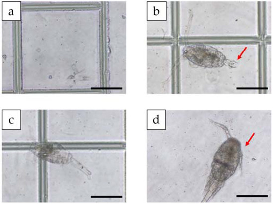 Figure 12a–d shows optical micrographs of plankton after 10 min of ultrasonic irradiation at each frequency. The scale bar is 200 µm. At 26 kHz, few plankton retained their original shape, and plankton parts were scattered in the observation area. At 200 kHz, there were many individuals whose parts were torn and body contents were released to outside their body. At 430 kHz, there were few external changes, but many individuals were found with released contents. Some individuals had partial dents and tears. At 950 kHz, broken antennae were confirmed. The shape change of plankton was partial.