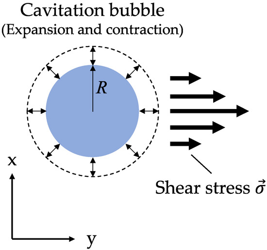 As shown in Figure 12, physical changes were confirmed in the plankton after ultrasonic irradiation. Because the shape change was partial, shear stress, which is a local stress generated from cavitation bubbles, was thought to be the plankton destruction mechanism. Figure 13 shows a schematic diagram of shear stress. As the cavitation bubbles expand and contract, a force is applied to the surrounding liquid medium and shear stress is generated. The value of shear stress can be estimated by the Equation (4) below [45].