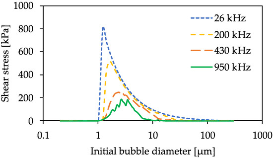 For the ultrasonic waves at frequency range used in the experiment, the value of the shear stress decreased with increasing frequency. In addition, the initial bubble diameter, which indicates the peak value of shear stress, increased with increasing frequency. Compared with Figure 11, there was agreement between the magnitude relationship with the inactivation rate and the magnitude relationship with the shear stress in the ultrasonic waves after 200 kHz. At 200 kHz, it was inferred that the bubble size distribution at each frequency was involved in the inactivation rate of 26 kHz, which was the largest shear stress. Tsochatzidis et al., (2001) reported that the bubble size distribution at 20 kHz is distributed over a diameter of about 3 to 40 μm and that there is a high frequency of bubbles with a size of around 10 µm [47]. Therefore, it is thought that the size distribution is almost the same even at 26 kHz. Furthermore, according to Brotchie et al., (2009), the bubble size distribution at 213 kHz is about 4–9 µm in diameter, and this bubble size distribution was measured for bubbles that undergo vigorous expansion and contraction that cause sonoluminescence [48]. Comparing the shear stresses in the region corresponding to the bubble size distribution at each frequency, we can see that 200 kHz exceeds the shear stress value at 26 kHz. From the above, it was considered possible that many bubbles exerted a higher shear stress when irradiated at 200 kHz.