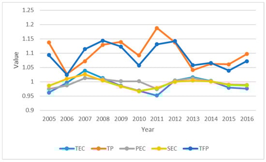 Figure 1 shows the dynamic evolution trend of technical efficiency change (TEC), technological progress (TP), pure efficiency change (PEC), scale efficiency change (SEC) and agricultural total factor productivity (TFP) from 2005 to 2016. Generally, a Malmquist index larger than 1 represents a positive TFP growth from t to t+1 [57] and TFP consists of TEC and TP. If the TEC is larger than 1, it means that the production of decision-making units is closer to the production frontier. Simultaneously, the variation in TC is positive with the movement of technical boundaries. Furthermore, TEC can be divided into PEC and SEC, which measures the variation in technology from the perspective of scale efficiency and pure technical efficiency.