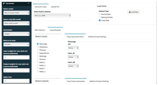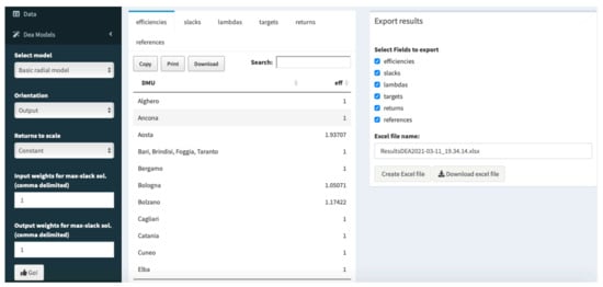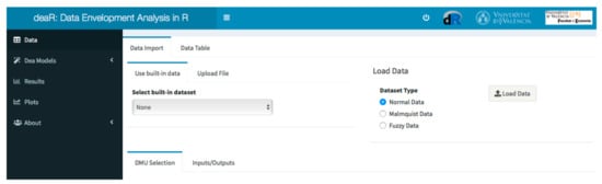 deaR-shiny is an interactive web application for DEA built with Shiny [] and shiny dashboard [], and it serves as a frontend for the functions defined in the deaR package [] to execute the selected DEA model and to get the results. Anyone can access the web app deaR-shiny in the URL: https://rbensua.shinyapps.io/deaR/ (accessed on 12 June 2021).