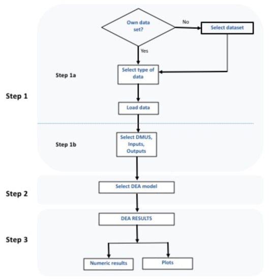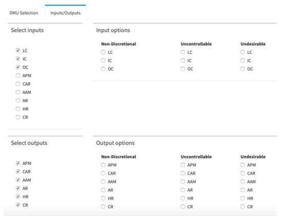 - DEA online (http://www.onlineoutput.com/dea-software/ (accessed on 12 June 2021)). The company offers a demo version with a limited number of inputs/outputs and number of DMUs.