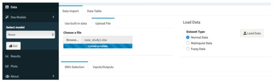 - Step 1 a: Loading data. Firstly, we can upload our own dataset (the app identifies the most common file extensions: txt, csv, tsv, xls, xlsx, sav, dta, xpt, etc.) or load a built-in dataset (deaR-shiny is not only oriented to research but also to teaching, so the application provides 24 built-in datasets from published articles). Once the data file is selected, we have to indicate the type of data we will work with, which depends on the analysis model to be applied. Thus, we will select the Normal Data option if a conventional DEA model is going to be executed, the Malmquist Data option to perform the Malmquist productivity index, or the Fuzzy Data option to run an FDEA model with uncertain data.To reproduce the results given in [], we need to click on the Upload file tab and then on the button Browse to select the Excel file (case_study1.xlsx). As the option Normal Data is selected by default, we only have to click on the button Load Data to load the dataset. We should see something similar as Figure 3.