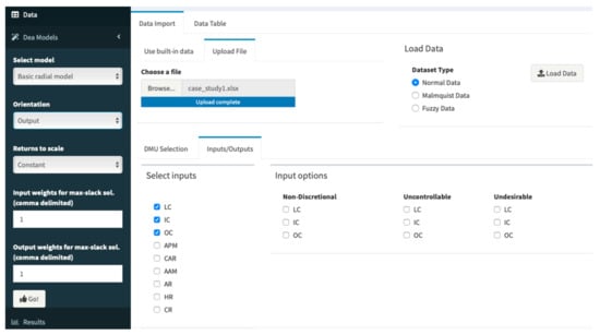 Carlucci, Cirà and Coccorese [] run two output-oriented conventional DEA models: the CCR and the BCC DEA models. So, to run the CCR model, we pull down the Select model, which is located on the left-hand column side, and choose the Basic radial model (see Figure 5). New options appear immediately. From the Orientation menu we select the option output, and from the Returns to scale menu the option Constant. If we had selected the option Variable, we would have selected the BCC DEA model.