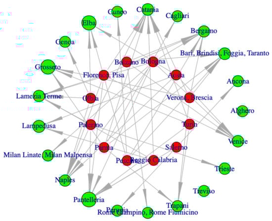 Thus, the reference plot (see Figure 7) is a graphical depiction of the reference sets of the inefficient DMUs. In this plot, the inefficient DMUs are represented as red nodes in the inner circle, while the efficient DMUs correspond to the green nodes lying in the outer circle. From each inefficient DMU, there is an arrow joining it with each one of the efficient DMUs in its corresponding reference set. Additionally, the size of each efficient DMU (i.e., each green node) is proportional to the sum of the intensities (lambdas) obtained in the different reference sets to which it belongs.