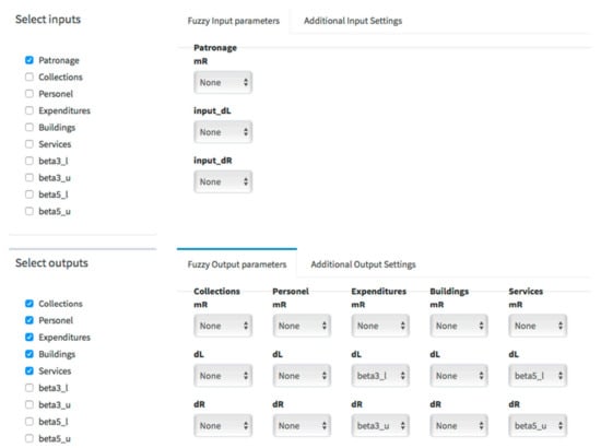 Now, we have to identify which variables are inputs and which are outputs. As mentioned above, Patronage is a crisp (non-fuzzy) input; Collections, Personnel, and Buildings are crisp outputs. Expenditures and Services have some missing observations. So, Kao and Liu [,] represent these two outputs by triangular fuzzy numbers, which are described by the triplet . In the Kao_Liu_2003 dataset, dL = beta_3_l and dR = beta_3_u for Expenditures. Similarly, dL = beta_5_l and dR = beta_5_u for Services.