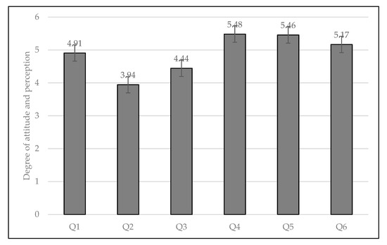 Mean scores of attitude and perception variables. Note: Q1: innovativeness; Q2: technological concerns; Q3: economic benefits; Q4: purchase subsidy; Q5: environmental benefits; and Q6: social influence/image. Error bars represent the 99% confidence interval for the mean.