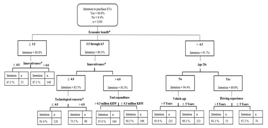 To better understand consumers’ intentions to purchase EVs, a multidimensional analysis considering interactions between factors was conducted using the tree-based regression technique. The regression tree method is useful because it can reveal data structures with complex interactions between variables without requiring a particular functional form [30]. An empirical tree is a segmentation of the data generated by applying a series of basic rules in decision tree modeling. Through the repeated splitting process, these models produce a set of homogeneous groups that can be applied for prediction. Chi-squared automatic interaction detection, classification, and regression trees are the most common tree methods [32]. This method is attractive because the resulting trees have a symbolic representation that is simple to interpret [33]. However, the approach cannot determine the degree to which each variable is statistically meaningful because it is a non-parametric procedure. To overcome this weakness, parametric models such as logistic regression are often developed together, enabling analysts to confirm the statistical significance of the identified factors.
