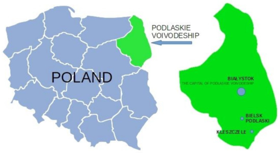 Bielsk Podlaski and Kleszczele. Location within Podlaskie Voivodeship (Source: Author, used file: https://pl.wikipedia.org/wiki/Plik:POL_location_map.svg#filehistory; accessed on 17 April 2021).