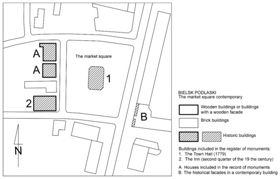 The only evidence of the historical shape of the buildings at the market square in Bielsk Podlaski is the western frontage (Figure 2). Its importance is confirmed by the inclusion of a roadhouse building in the register of monuments [57], as well as two houses in the provincial register of monuments (No. 7 and No. 9 Town Hall Square) [58]. The square is also located within the boundaries of a fragment of the urban layout entered in the register of monuments.