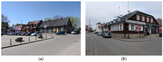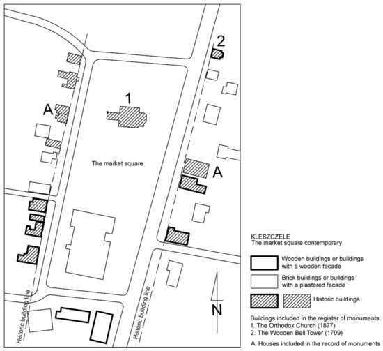 Both cities have market squares preserved in their historical shape. They are located by the main historical transport routes passing through the city. With time, in such an urban layout, the main road transformed into the most important street of the town. The square is usually compositionally connected with sacral buildings located along the main road. All these elements create a clearly outlined compositional axis. Such a market layout can be found, e.g., in Bielsk Podlaski and Łuków [47] (p. 103). In the case of Kleszczele, this layout has not been fully formed due to a limited overall development of the town. Moreover, a temple has been located on the market square from the very beginning. Perhaps, the reason for locating a church in the market square was the size of square, which in the case of Kleszczele, was about 200 m long. After the land for the church square was occupied, there was still enough space to perform all the functions of the market square. As in each of the historic towns of Podlasie, the discussed cities also had wooden buildings for a long time. Today, only a few have been preserved in the market squares.