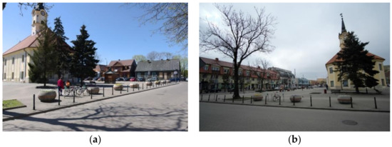 The Market Square—currently, in addition to the church located in the northern part of the square (Figure 9a), the large southern section of the market square is occupied by a school building constructed in the second half of the 1990s. The space between these buildings is filled with tall greenery planted in the 1930s and 1940s (Figure 9b) [62]. As a result, the square as a single space is illegible. The frontages are invisible or poorly visible from the market square. It is reasonable to leave the old trees around the church. However, in the future, the high greenery in the undeveloped part of square should be only partially removed. In this way, at least in some parts, the square would be perceived as a single space.