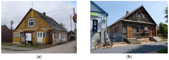 Bielsk Podlaski and Kleszczele are towns, in which some small wooden buildings, mainly houses, have been preserved. Preserved wooden buildings in one of the frontages of the market square in Bielsk Podlaski are the remains of the buildings which dominated even before World War II. The frontage has a significant value from the point of view of the historic preservation of the urban landscape. In addition, individual wooden buildings have historic value. The reconstructed inn dating from the first half of the 19th century is a valuable example of urban public buildings. Its value is confirmed by its entry in the register of historic monuments. Two other wooden buildings in the frontage are examples of typical bourgeois houses, which in the past were an important element of the city development. Both buildings are listed in the register of monuments. Together they form a frontage preserved in its historical shape. A small number of wooden houses have survived in the market frontage of Kleszczele. As early as the late 1970s, attention was drawn to the architectural and functional solutions of the houses in the market square and its vicinity [41]. Their basic characteristics have been identified. The houses are situated gabled to the street. The gable elevation facing the street is decorative—it houses the entrances. The interior layout is two-bay and symmetrical. Houses located in other parts of the city are smaller and have less representative character.