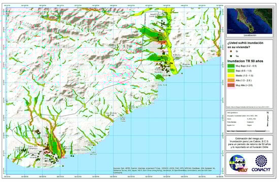 We included an analysis of the spatial-temporal distribution of flooding related to extreme hydrometeorological events through flooding hazard maps, because it is important to know which areas and populations are under threat for risk management scenarios; this is important due to a known association between cyclonic activity and storm-surge flooding in coastal zones [29]. The results showed that, in the municipality of Los Cabos, 34.8% of houses have suffered flooding; however, the community’s perceptions about vulnerability due flooding are not a predictor of their vulnerability perceptions due to tropical cyclones. In other words, inhabitants can underestimate the potential negative effects of this factor (data georeferenced in Figure 1). These georeferenced survey results and flooding hazard maps showed sensible information for prevention of losses and are especially useful as a base to build dynamic models that perform process simulation and forecast in future events, especially for sites that have suffered a loss of biodiversity, as is the case for Los Cabos because of its urban development [36,39].