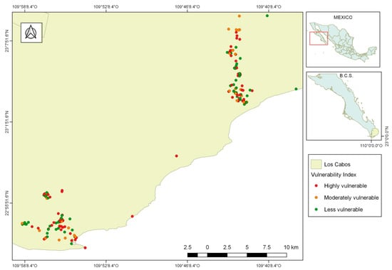 Georeferenced vulnerability index from the surveys applied in the municipality of Los Cabos, Baja California Sur, Mexico.