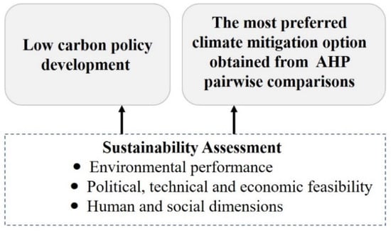 A modified sustainability assessment method [14,18] was employed to assess the sustainability of adopting low-carbon policies in the energy sector and implementing the most preferred climate policy measures derived via the AHP technique. As presented in Table 1, all environmental, technological, and socio-political aspects were designed to assess the sustainability of proposing climate mitigation policies in Chiang Mai, Thailand.