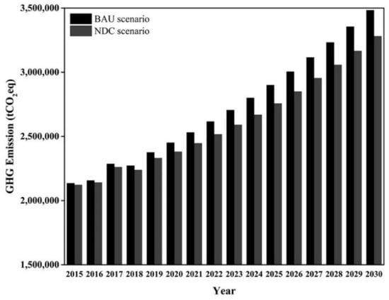 Regarding GHG mitigation scenarios, both the business-as-usual (BAU) scenario and the Nationally Determined Contributions (NDCs) mitigation plan were projected. CO2 emissions in 2015, which was the base year, were estimated and forecasted to the target year, 2030, in the BAU scenario, which assumes no additional climate change or introduction of energy policies. In the NDC scenario, the following policy interventions and measures indicated in Thailand’s NDC are accounted for: (i) energy-saving strategies (i.e., installing LED lights and using more efficient heating and cooling systems, energy-efficient appliances, and high-efficiency cooking stoves) and (ii) applying renewable energy (i.e., solar power and biogas energy). Chiang Mai’s provincial economic growth rate was estimated at 4% to forecast trends in GHG emissions between 2015 to 2030 using Equation (2).