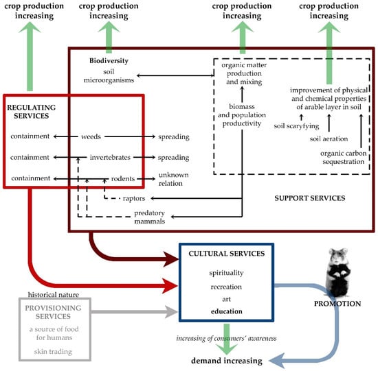 The services provided by the common hamster in agricultural ecosystems were qualified for four categories: provisioning, support, regulating, and cultural services. Within the categories, tangible benefits were identified as a result of the species functioning in the agricultural environment and contributing to the increased effectiveness of crop production. A conceptual scheme of the relationship between the services provided by the common hamster and existing, lost, and potential benefits for agricultural producers is presented in Figure 1.