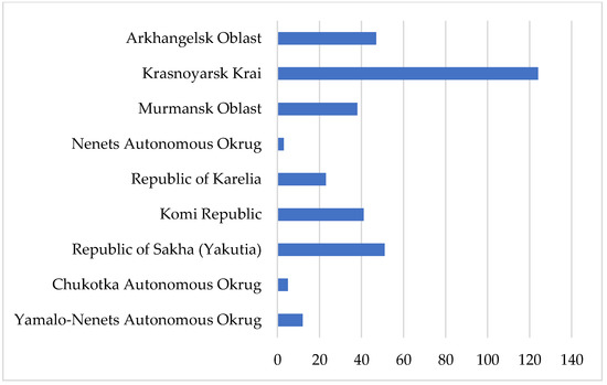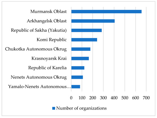 The sample includes a total of 2240 organizations from all entities that form part of the Russian Arctic. Data on the number of interviewed employers in each region are presented in Figure 1.