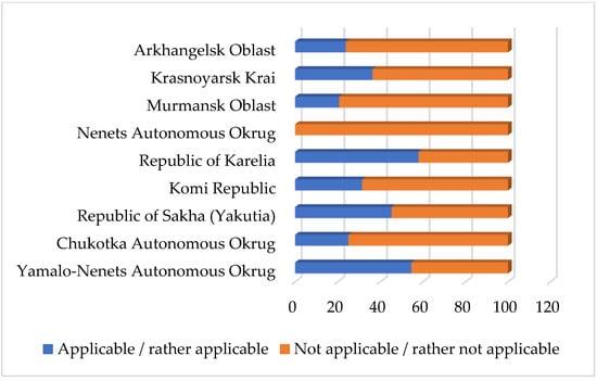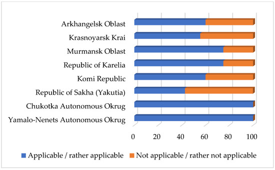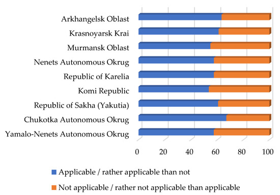 A survey of educational institutions of higher and vocational secondary education operating in the Russian Arctic revealed the following results of work. Unlike employers, organizations of secondary vocational education (64.98%) believe that the practice of obtaining an online education is not applicable to the conditions of the Arctic region. At the same time, a significant difference was recorded in the answers of organizations of higher education. On the contrary, most of them (62.5%) believe in the possibility of using distance education in the Russian Arctic. In the context of the regions, only in the Yamalo-Nenets Autonomous Okrug (54.55%) and the Republic of Karelia (60.87%) did the majority of educational organizations recognize the applicability of this form of education (Figure 6 and Figure 7).
