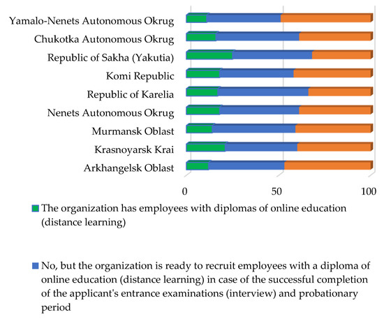 The skepticism of educational organizations regarding the applicability of online education for the Arctic territories is partially confirmed by their low level of readiness to hire a specialist with an online education diploma; only 27.68% of organizations are ready to do this. At the same time, the share of university representatives who are positively disposed on this issue is slightly higher (35%) than the share of colleges and technical schools (26.69%). Among the subjects, the Yamalo-Nenets Autonomous Okrug (only 18.18% are ready to apply this practice) and the Chukotka Autonomous Okrug (20%) stand out on this issue. The highest indicator of readiness for adoption is shown by the Komi Republic educational organizations—37.5%.