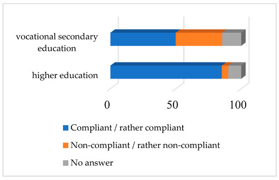 The answers of employers to the same question are multivariate, depending on the type of their economic activity. The impossibility of considering applicants with an online education diploma was mainly stated by organizations working in the fields of mining (53%), manufacturing (51%), water supply (52%), construction (51%), transportation and storage (55%), and real estate (58%). Employers in the following types of economic activities declared their readiness to hire such candidates: the activities of hotels and catering establishments (63%), activities in the field of information and communications (63%), and financial and insurance activities (75%). A noteworthy fact was that there was a certain discrepancy in the answers to previous questions from employers in the water supply sector (68% stated the applicability of online education) and finance (only 46% supported the idea of the applicability of distance learning). Perhaps this is due to the lack of a clear understanding of the various forms of distance education.