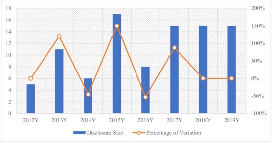 From 2012 to 2019, the Chinese Forestry Industry Association (CFIA) and the Chinese National Forest Products Industry Association (CNFPIA) ushered in the disclosure of 92 CSR reports (2011–2018) by 31 forestry companies (CNFPIA, 2019) [61]. These 92 CSR reports are released separately and voluntarily and are different from the annually released reports of other publicly listed forestry companies. Figure 2 shows the trend of CSR reporting by Chinese forestry enterprises advocated by CNFPIA and CFIA from 2012 to 2019. Our study selected 15 forestry companies from the 31 forestry companies, which had more than two years of disclosure experience, were all above medium-sized, and representative of Chinese forestry enterprises recommended by CNFPIA. Discarded companies only had one year of discontinuous disclosure experience. The selected companies operate in various parts of China and include large state-owned, large public-listed state-owned, large non-public-listed state-owned, large private, and medium-sized private companies (detailed information about the enterprises in Appendix A).