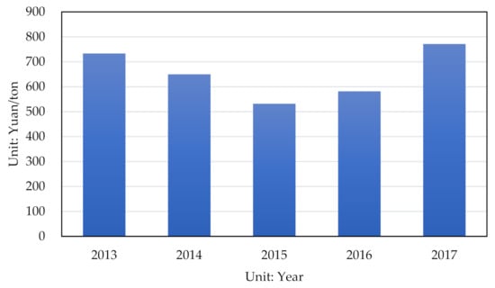 Global warming caused by CO2 emissions has caused a certain negative impact on the human living environment. The Paris Agreement requires that the global average temperature rise in this century should not exceed 2 °C and that the global temperature rise should be limited to 1.5 °C [1]. For this reason, it is necessary to phase out carbon emissions from fossil fuels and other anthropogenic sources [2]. The global demand for electricity will continue to increase, and its share of final energy consumption is also expected to rise [3]. The production and supply of electric power and heat power account for more than 40 percent of world’s CO2 emissions related to energy, because fossil fuels are still the major factor in thermal power generation. Coal, in particular, has long been the most important fuel for the thermal power industry. In terms of a report released by the IPCC, thermal power generation must be gradually stopped by 2050 to realize the global temperature rise target [4]. Especially in the past few decades in China, thermal power has been the main form of electronic generation, which has generated over 80% of the total power during this process. Nevertheless, since the “separate power plants from the grid” and “yardstick power price” came out and have been applied by certain sectors, the electricity price has not kept pace with the rise in market-oriented coal prices [5]. Moreover, the cost of coal and labor occupies a large proportion of the total cost of the thermal power industry—the fluctuations of coal prices and the increases in labor costs had great impacts on the profit level and cost control of coal-fired power enterprises over the sample period, as shown in Figure 1 and Figure 2. In recent years, the performance of the thermal power plants has declined. Therefore, it is extremely essential to alleviate and turn around the decline in performance [6].