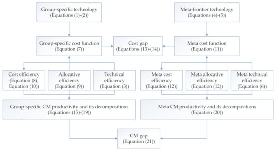 where the value of > 1 implies that the group-specific CMPI converge to the meta-CMPI. It can also reflect that the group-specific CMPI grows faster than the meta-frontier CMPI. If the value of < 1, this indicates a divergence. If the value of a gap is equal to 1, this means it is a constant gap. The same definition is true for the four decomposed terms. Figure 3 presents the sequence and connection of the different steps in this section. The detailed information of mathematical programming to each group-specific DF and meta-DF is presented in Appendix B.