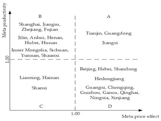 In addition to the analysis about the estimated results of group-specific CMPI and the breakdown of these, we utilized the matrix proposed by the Boston Consulting Group (BCG) to analyze and make the comparison of provincial meta-CMPI data and the breakdown of these results. Based on the empirical results of meta -TE, -AE, -T, and -PE, the pure meta-productivity was calculated by the sum of meta-TE and meta-T, which was viewed as the Y-coordinate. The meta-PE was used as the X-coordinate to compare the growth of price effect among provinces. We took the 1.00 and 1.00 as the midpoints of the meta-productivity and meta-PE, respectively. Four quadrants corresponded to four different types of performance on productivity and price effect. If the meta-productivity and meta-PE were both greater than 1, this indicated that it was a high-performing province in the thermal power industry, which is called the professional province. If the meta-productivity was greater than 1.00 and meta-PE was less than 1.00, this signified that it was a province that benefitted from the price effect, but met productivity has not risen significantly. We describe it as a divisional province. If the meta-productivity was less than 1.00 and meta-PE was less than 1.00, this indicated that there was no positive price effect and significant productivity growth in this province, which is described as a stalemate. In the fourth quadrant, meta-PE was greater than 1.00 and meta-productivity was less than 1.00, this type of province is described as price benefit.