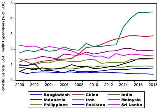 A few research studies revealed that high government expenditure is distributed and allocated less productively considering increases mortality rates [44,45,46]. The result of higher public spending on health care is not always better health outcomes due to inefficiency in spending [12]. By using panel data, [47] econometrically evaluated that economic growth is undoubtedly an important factor affecting health outcomes and government spending on health and is a significant factor in developing countries. The availability of physicians, female literacy, and child immunization also contribute to health status improvements [45].