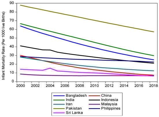 The authors of [48] revealed that ecological footprint consumption increases infant mortality. The per capita income and growth significantly affects infant mortality [41].The authors of [49] revealed that trade tends to decrease the child mortality rate significantly in the long run. The authors of [50] concluded that unemployment increases infant mortality rate in Italy. The authors of [51] show that improved sanitation reduces infants’ death.