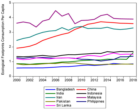 In Figure 3, the ecological footprints global hectares per person in Asian countries show an upward trend. However, a downward tendency is observed for Malaysia and China.