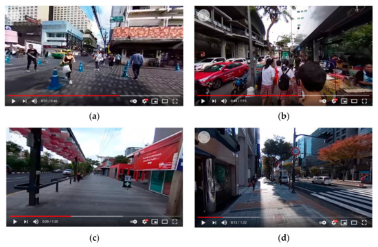 The first case study street is around Siam Square shopping district (panel a), around Siam Station, where two urban railway lines intersect, namely the BTS Sukhumvit and BTS Silom lines. The second case study street, Silom street (panel b), links the office building district to the intersection point of two railway lines, namely Sala Daeng station of the elevated BTS green line and Silom station of the underground blue line. These two streets are the typical walking spaces in the city center of Bangkok, where large spaces are allocated to car traffic, but a narrow area is provided for pedestrian traffic where vendors and other informal activities are obstacles to walking conveniently.