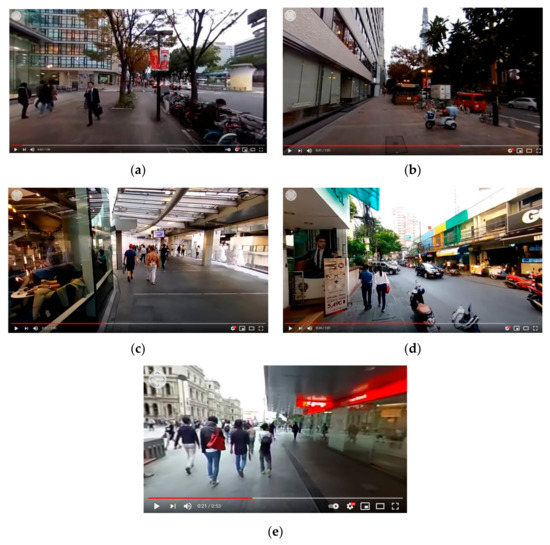 The five case study streets for the Bangkok experiment consisted of three streets in Bangkok, one in Nagoya, and one in Brisbane, and a snapshot of each is shown in Figure 1 panels (a) to (e), respectively.