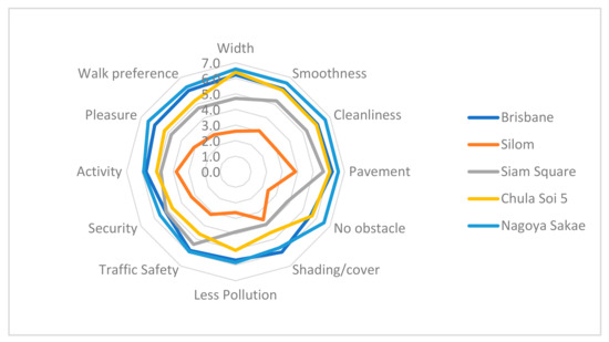 The evaluation results are compared among the case study streets (Figure 5). In terms of street design, the Nagoya streets have a wider walkway, more parking vehicles, more traffic volume, and more green streets. In comparison, in the Bangkok streets, for Sukhumvit Soi 23, the characteristics are a narrower walkway, more parking vehicles, heavier traffic, and more street activities, although the skywalk is protected from traffic. As the Brisbane case study street is pedestrianized, it has a wider walkway, less parking vehicles, less traffic volume, and more street activities. For the walking needs, the Nagoya case study streets are evaluated as being better for the lower-level needs, including for legiblity, no obstacles, safety, and security, but the higher-level needs, including protection, vibrancy, and originality, are evaluated worse. On the other hand, the Bangkok streets are evaluated in the opposite way, with a low-rated score in the lower-level needs and a high score in the upper-level needs, which is particularly the case for Chula Soi 5. The Brisbane case study street is evaluated highly for both needs. The scores of the Bangkok skywalk are relatively close to the Brisbane street, as they are both pedestrian-dedicated spaces.