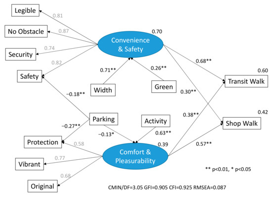 The model is judged satisfactory as all of the parameters are statistically significant, where most of the goodness-of-fit indictors are within the acceptable range for CMIN/df = 3.05 (<5), GFI = 0.905 (>0.9), and CFI = 0.925 (>0.9), while RMSEA = 0.087 is marginal (<0.08 good). The street design factors influence walking needs significantly as the model accounted for 70% of variance in convenience and safety, and 39% of comfort and pleasurability. Width, greenery, and street activity positively satisfied the walking needs, while street parking negatively impacted comfort and pleasure as well as safety. Likewise, the walking needs influenced walking behavior significantly, as the model accounted for 60% of variance in transit walk willingness and 42% shop walk willingness. It was found that the lower-level needs for convenience and safety affected transit walk willingness more significantly than comfort and pleasurability. On the other hand, the impact of the higher-level needs for comfort and pleasurability was more dominating for shop walk.