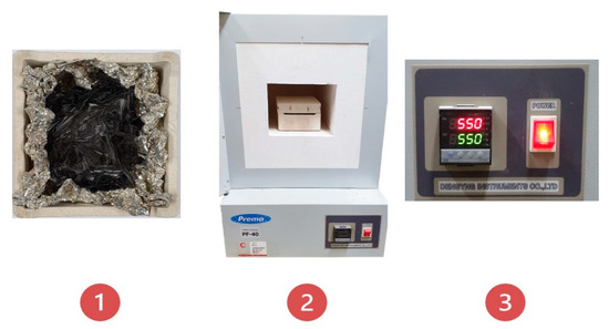 The carbon fibers were immersed in pure water for one day, and then we performed GC-MS testing on the immersion solution to identify the type and boiling range of the coupling agent and other substances. The coupling agent was found to be C26H48O3Si with a molecular weight of 436.74 g/mol under the boiling point of 507.1 ± 50.0 °C at a pressure of 760 mm-Hg [18]. The removal of the coupling agent process is shown in Figure 1; the carbon fibers were wrapped with aluminum foil and then placed into a Muffle furnace (PF-40, Chuan-Hua Precision, New Taipei City, Taiwan) at a high temperature of 550 °C for 3 h.