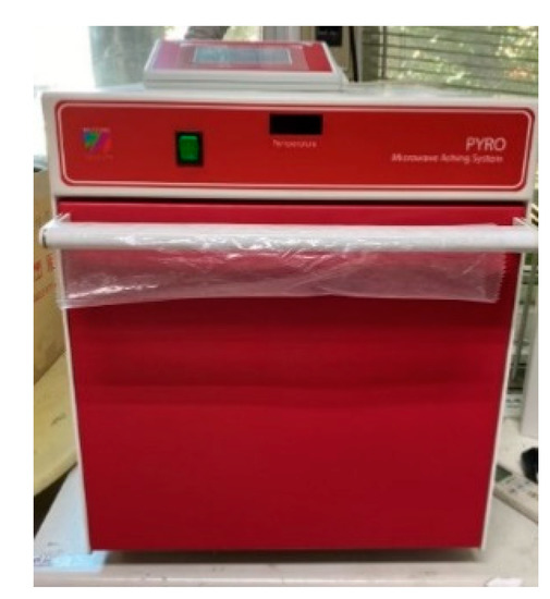 In the MAP technology, the microwave heat radiations can transfer through the carbon fiber from inner to outer. It can remove the resin from the CFRP bicycle frame scrap to transfer into recycled carbon fiber. Figure 3 shows the microwave machine (PYRO 260, Milestone, Sorisole, Italy) at the Department of Molecular Science and Engineering Laboratory of the National Taipei University of Technology, Taipei, Taiwan. The recycled carbon fiber was obtained from the carbon fiber scrap by using the MAP process in the microwave machine at 950 °C for 1 h, and then a single filament tensile test was carried out.