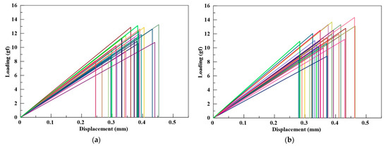 The load–displacement curves of the single filament tensile test: (a) Normal carbon fiber, (b) Recycled carbon fiber.