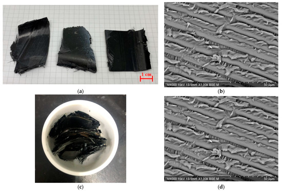Photos and SEM images of fragment samples of recycled carbon fiber composite materials. (a) Fragment samples of recycled CFRP before MAP technology; (b) SEM image before MAP technology; (c) fragment samples of recycled CFRP after MAP technology; (d) SEM image after MAP technology.