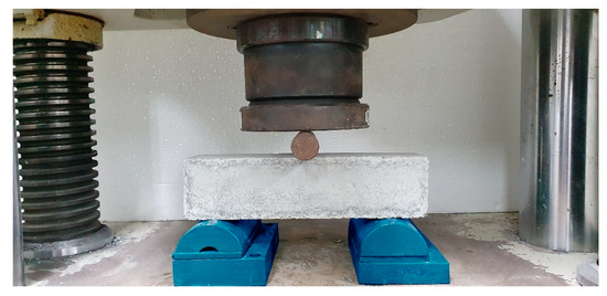 According to ASTM C293-02 [38], the bending test of 28 cm × 7 cm × 7 cm CFRC specimens was carried out by a universal testing machine (HT-9501 Series. Hong-Ta, Taipei, Taiwan) with a load cell (WF 17120, Wykeham Farrance, Milan, Italy). The bending specimen was tested in the material laboratory of the Department of Civil and Disaster Prevention Engineering, National Taipei University of Technology. The three-point bending test is shown in Figure 7.